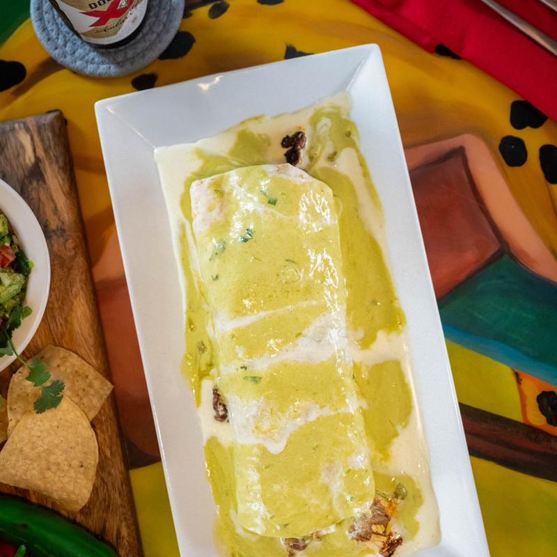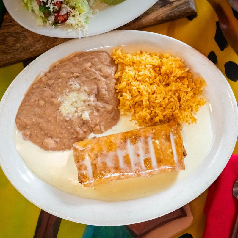 A super large flout tortilla filled with your choice of meat from the list below. Then it is deep-fried to a golden brown. Topped with cheese dip. Served with rice, refried pinto beans or whole black beans, lettuce, sour cream, guacamole & pico de gallo.