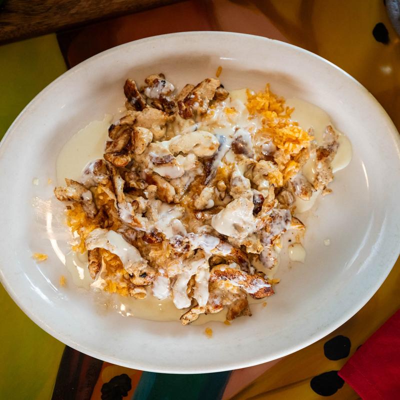 Fresh corn tortilla chips topped with your choice of meat from the list below, then melted cheese & cheese dip served with sour cream on the side. Shredded chicken, pork, ground beef, and shredded beef fillings are precooked with onions & tomato.