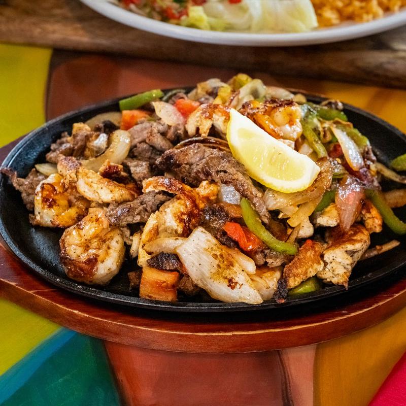 All the fajitas are served hot and sizzling on a cast iron skillet with sautéed onion, bell pepper & tomato. Served with rice, refried beans or black beans, lettuce, sour cream, guacamole, pico de gallo, and corn or flour tortillas.