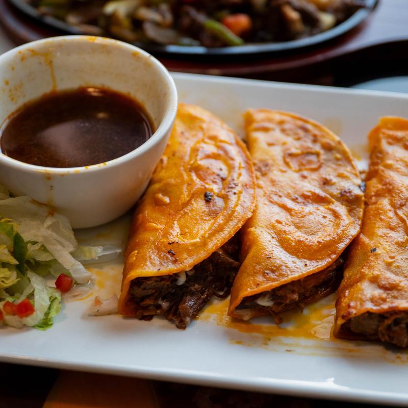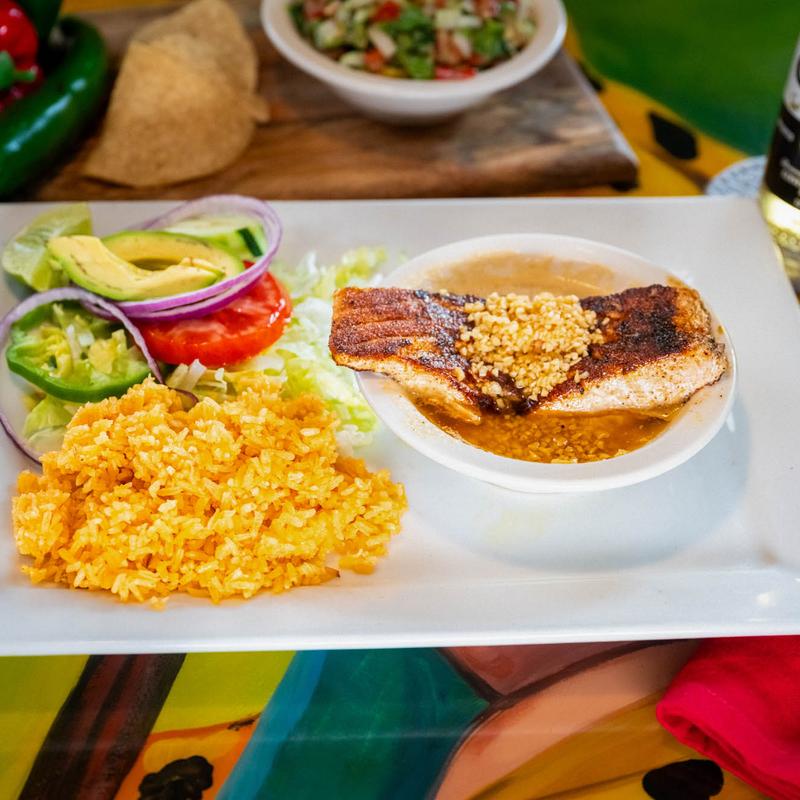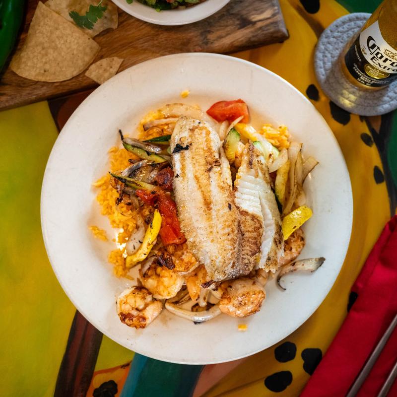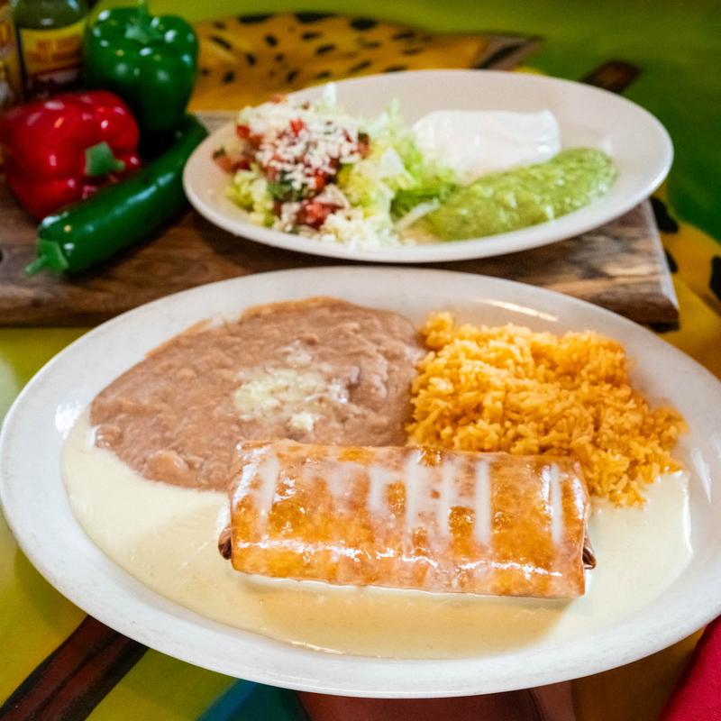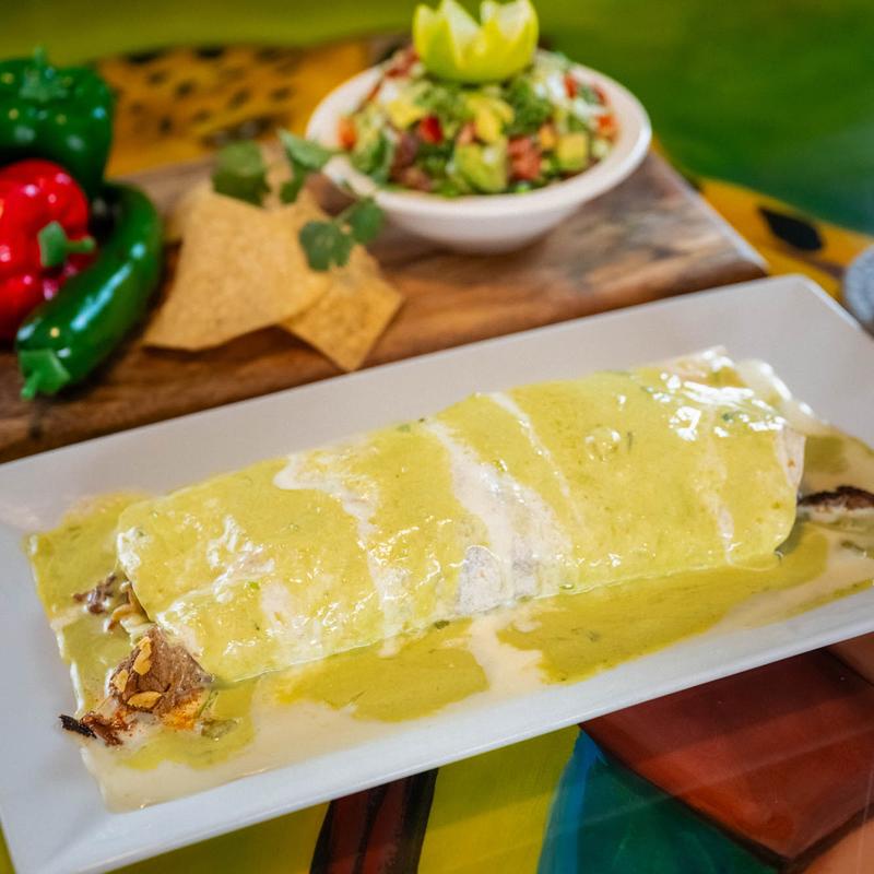 A large flour tortilla stuffed with cheese and filled with your choice of meat from the list below. Then grilled to perfection. Served with rice, refried beans or whole black beans, lettuce, sour cream, guacamole, and pico de gallo.
